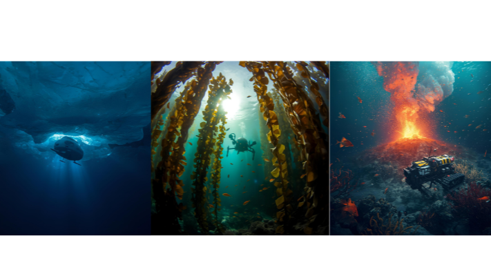 Underwater vehicles exploring under ice shelves (left), in kelp forests (center), and near an underwater volcanic eruption (right)