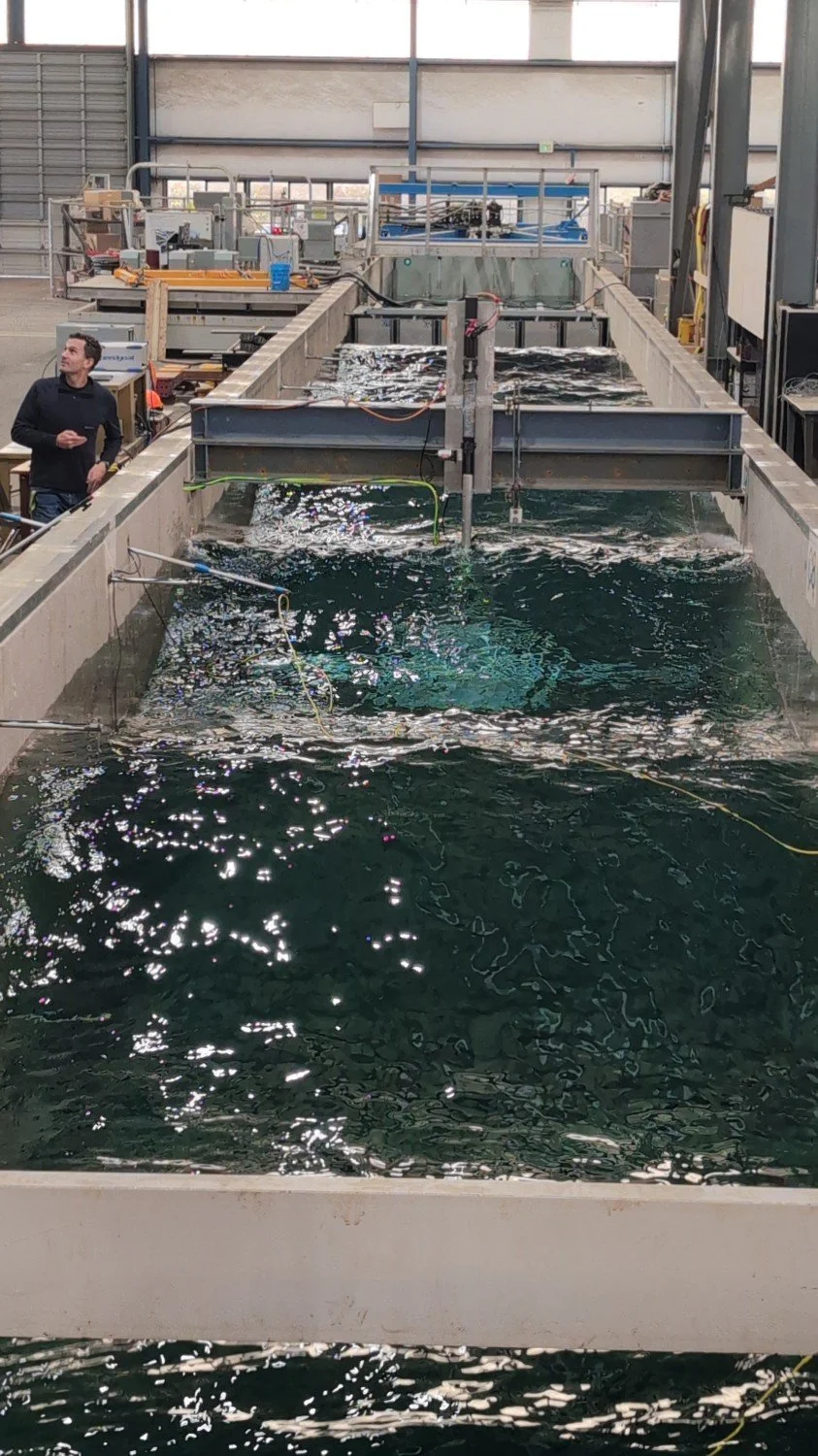 The Hinsdale Wave Research Laboratory at Oregon State University, a massive 7,500 square meter building, hosts the largest wave flume in North America. It’s a 104 meter long channel, 4.7 meters deep and designed for offshore wave and tsunami research.