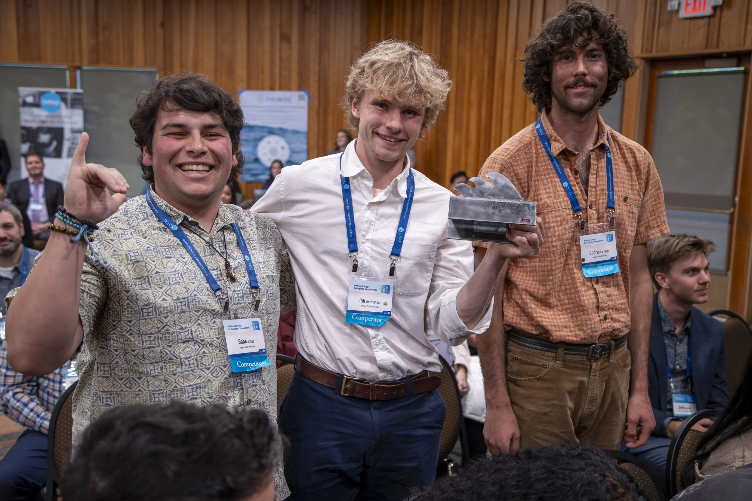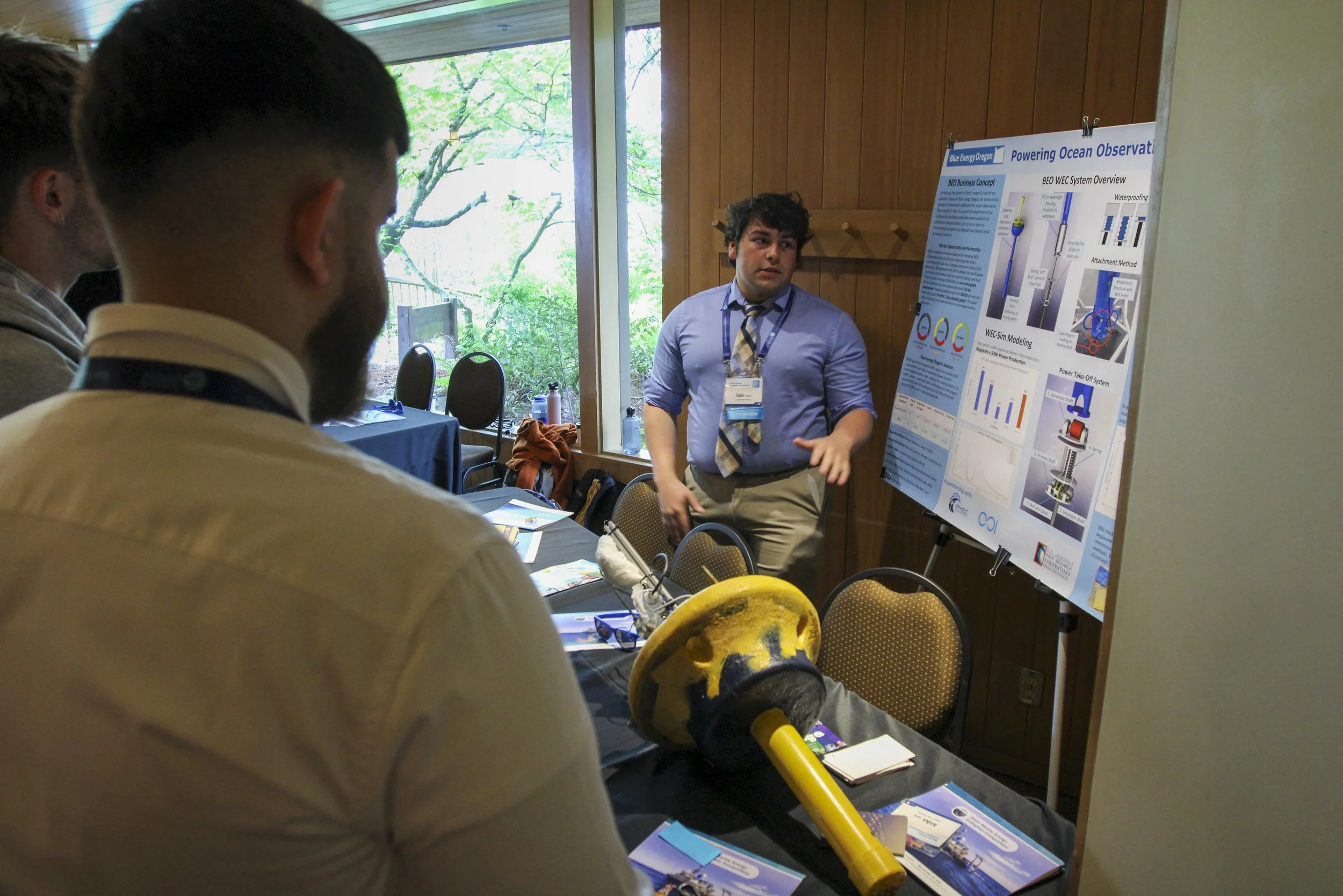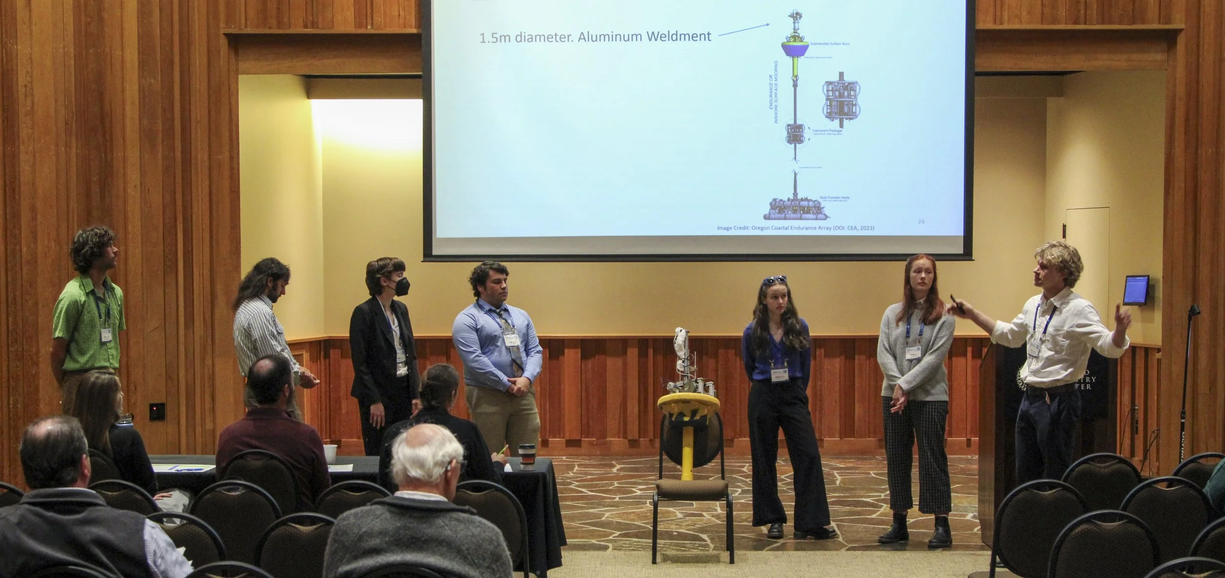 The 2024 Marine Energy Collegiate Competition was held at the Ocean Renewable Energy Conference (OREC) in May. The teams were faced with four challenges, which focused on market analysis, technical design, prototype testing and community engagement. OSU partnered with the Corvallis Ocean Observatories Initiatives (OOI) staff, designing a wave power system for the OOI inshore buoys. The team divided and conquered, with senior engineering students taking on the technical design and prototype testing, while the rest of the team worked together on the market analysis and community engagement portions. Their goals were to produce a suitable final project,build a scale Wave Energy Converter (WEC), and successfully reapply to next year’s MECC.