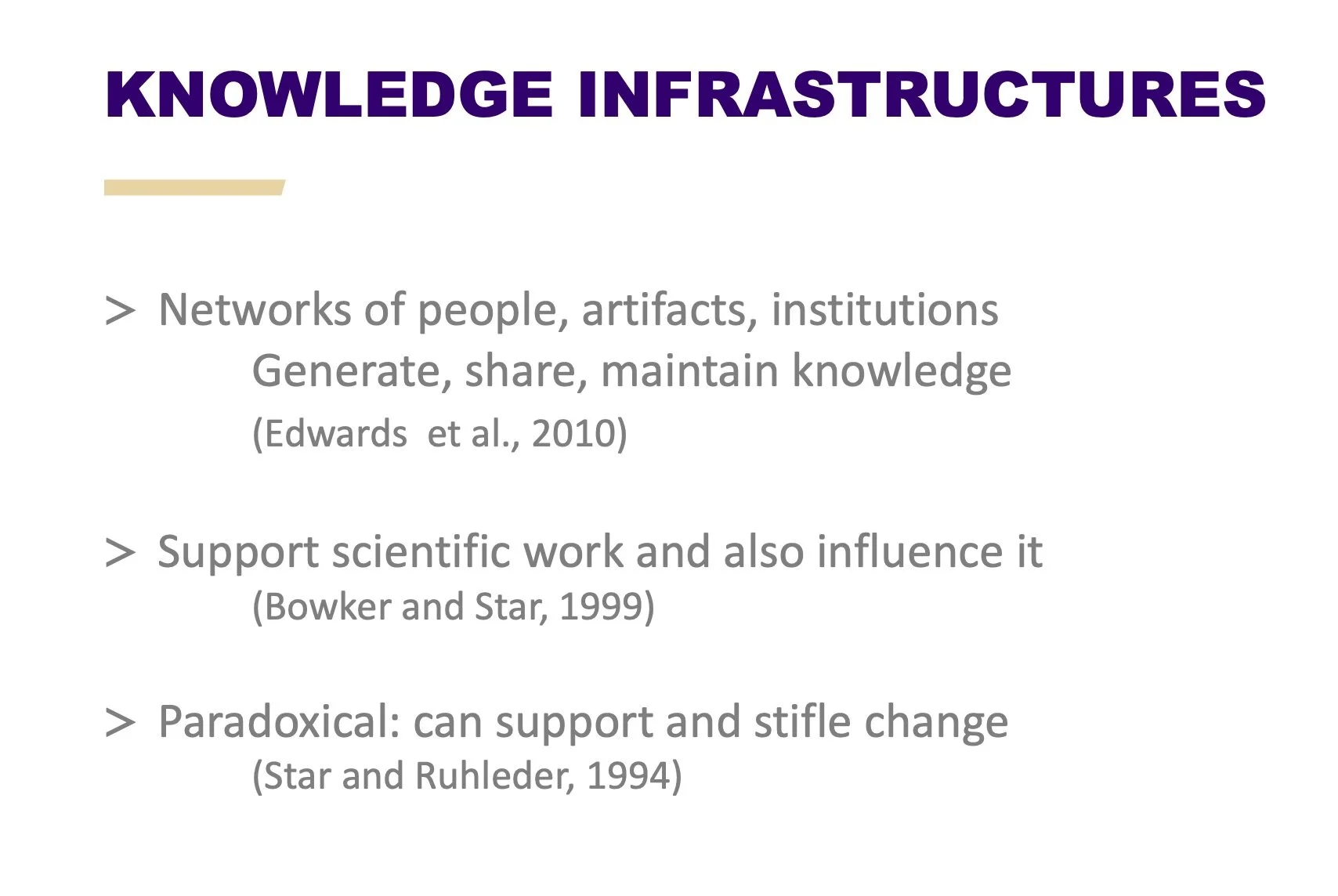 Social scholars have defined knowledge infrastructures as “robust networks of people, artifacts, and institutions that generate, share, and maintain specific knowledge about the human and natural worlds” (Edwards et al. 2010).